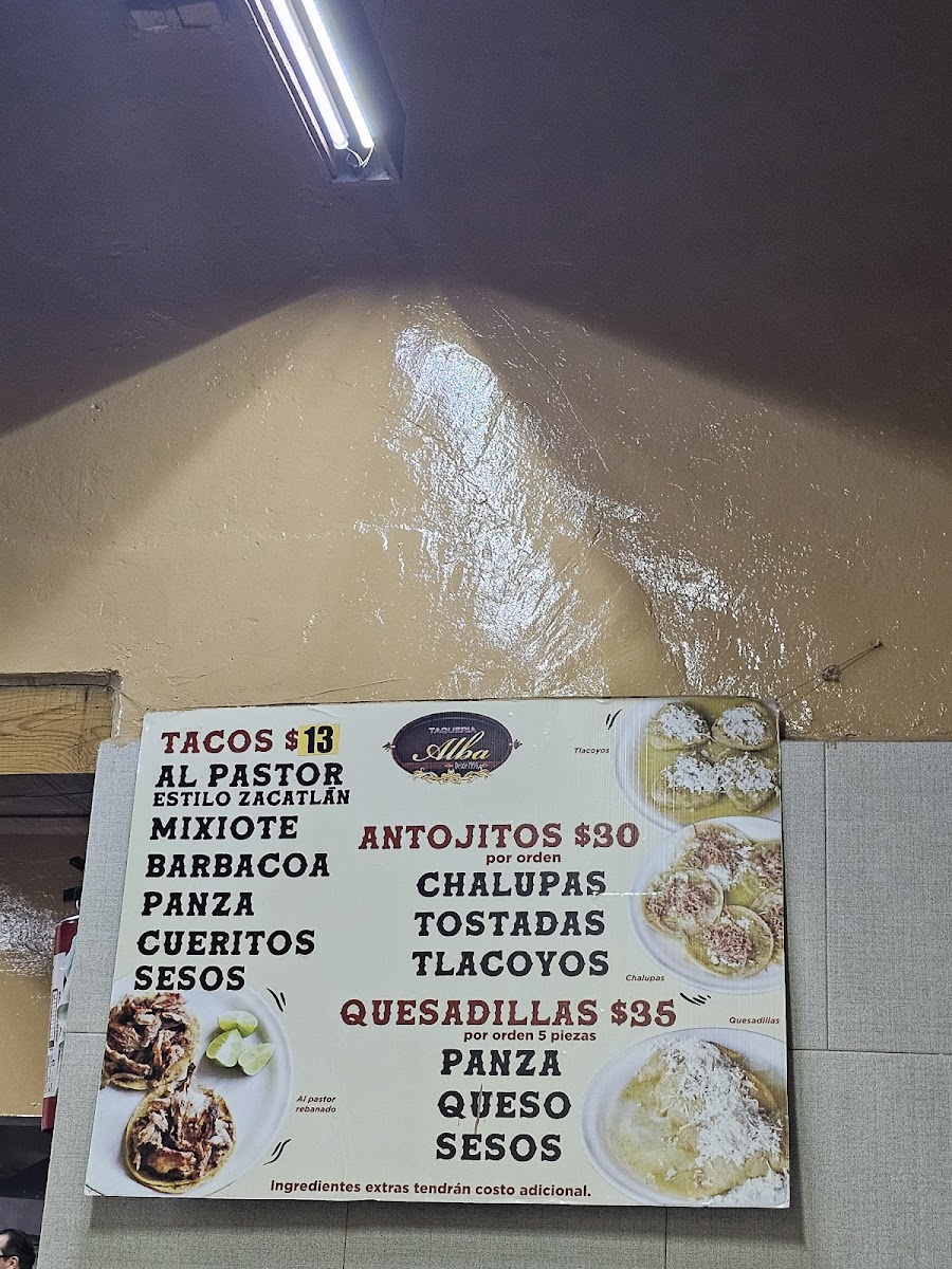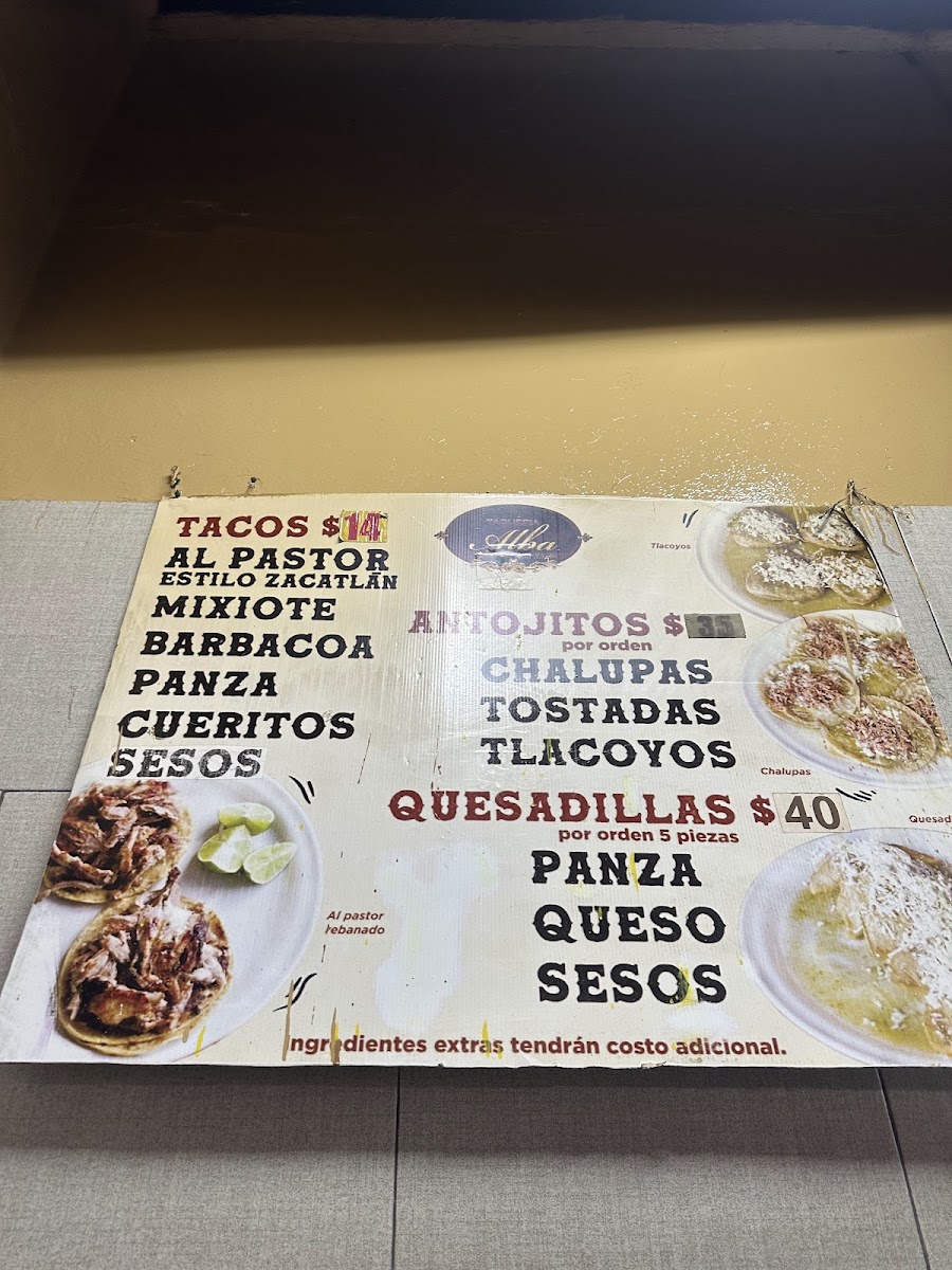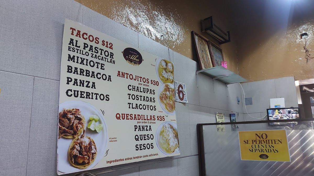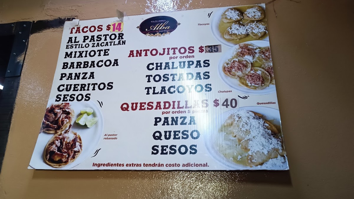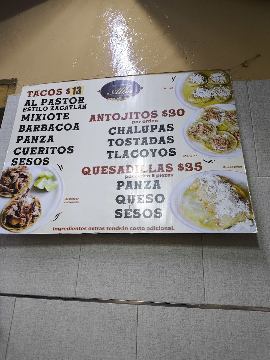 The menu at Taqueria Alba Hermanos Escamilla features a variety of traditional Mexican fast food items centered around tacos and related antojitos. Visitors can expect a selection that includes chalupas, barbacoa, tacos such as Al Pastor Zacatlán and Tacos de Panza, as well as tostadas and quesadillas de panza. Complementing the food offerings are various salsas, including salsa verde and other traditional sauces, along with typical condiments to enhance the taco experience.