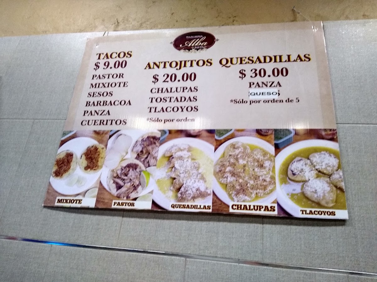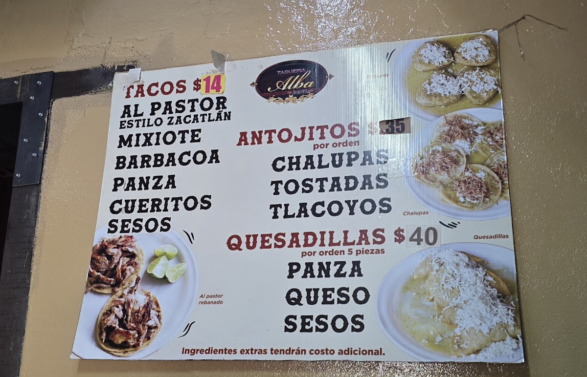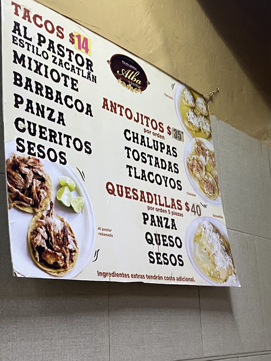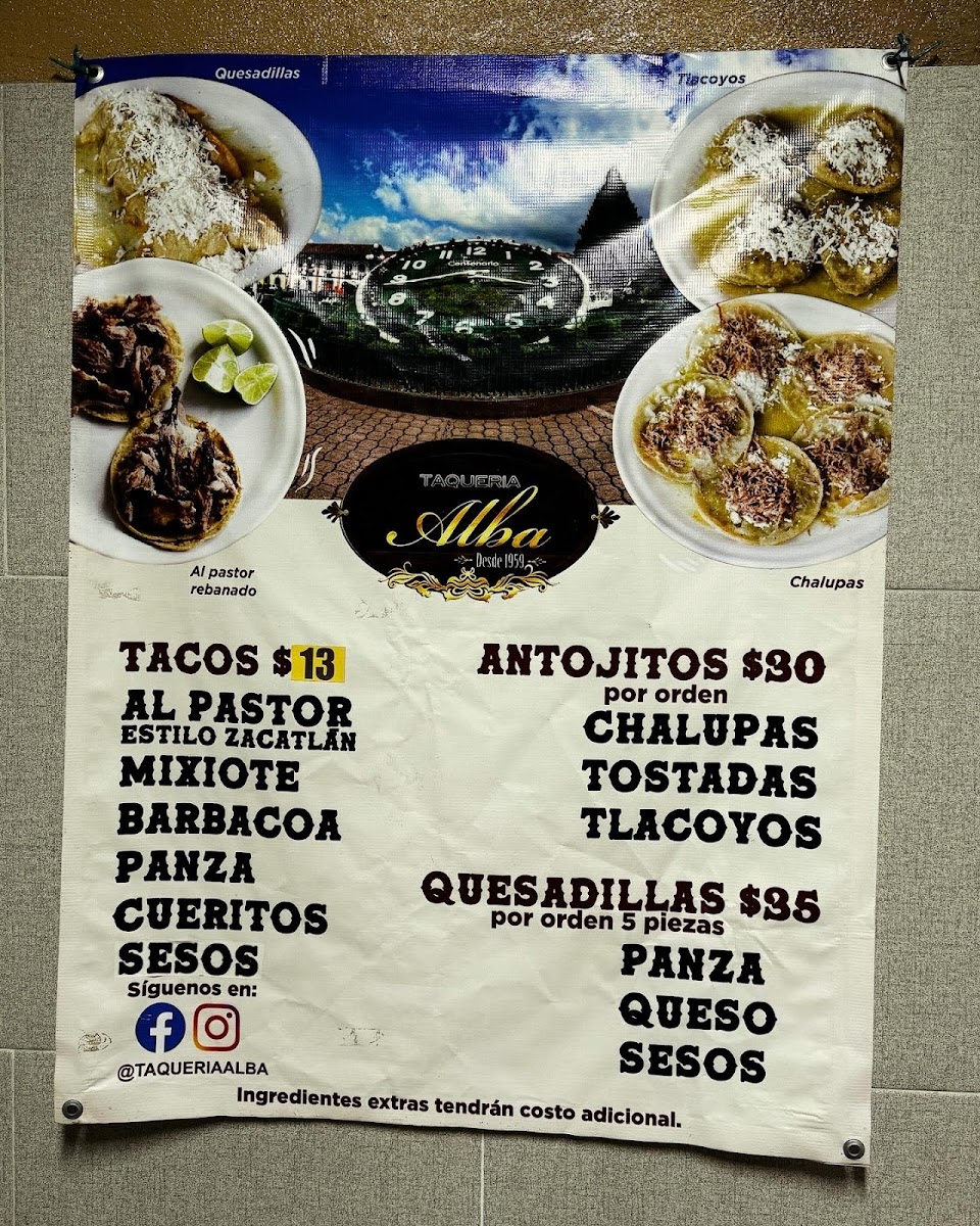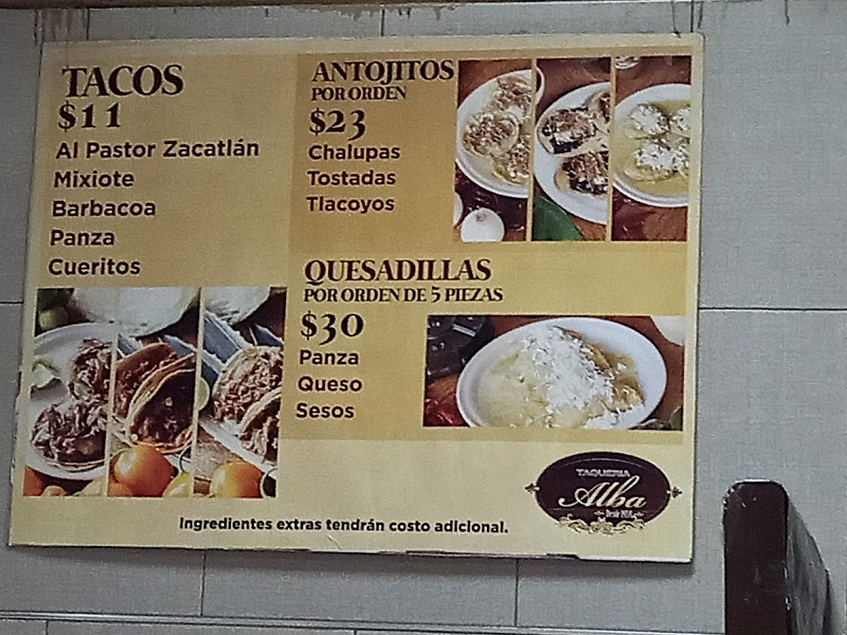 The menu at Taqueria Alba Hermanos Escamilla features a variety of traditional Mexican fast food items centered around tacos and related antojitos. Visitors can expect a selection that includes chalupas, barbacoa, tacos such as Al Pastor Zacatlán and Tacos de Panza, as well as tostadas and quesadillas de panza. Complementing the food offerings are various salsas, including salsa verde and other traditional sauces, along with typical condiments to enhance the taco experience.